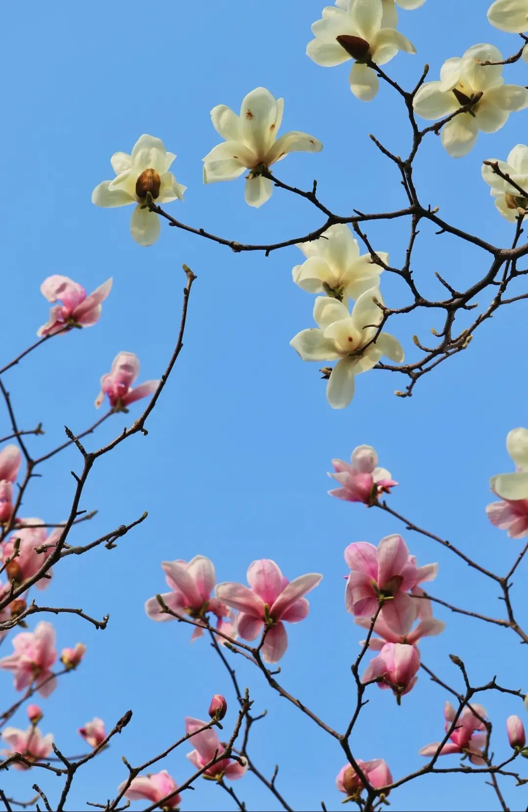 “霓裳片片晚妆新,束素亭亭玉殿春。”春日的南京雨花台,玉兰花开时就是最美的风景!紫玉兰外层染着浓郁的绛紫,内侧渐次过渡为淡粉,尽显雍容厚重。白玉兰冰肌玉骨,花瓣洁白莹润,舒展如莲。二乔玉兰点缀其间,花瓣白紫相间,斑驳雅致。
