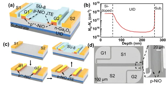 图1 (a) 具有 p-NiO 双结终端延伸(D-JTE)的Ga2O3单片双向开关(MBDS)三维结构示意图。(b) Ga2O3 外延层的ND-NA 掺杂深度分布。(c) 关键器件制备工艺步骤示意图。(d) 制备的 Ga2O3 MBDS 的SEM图像。