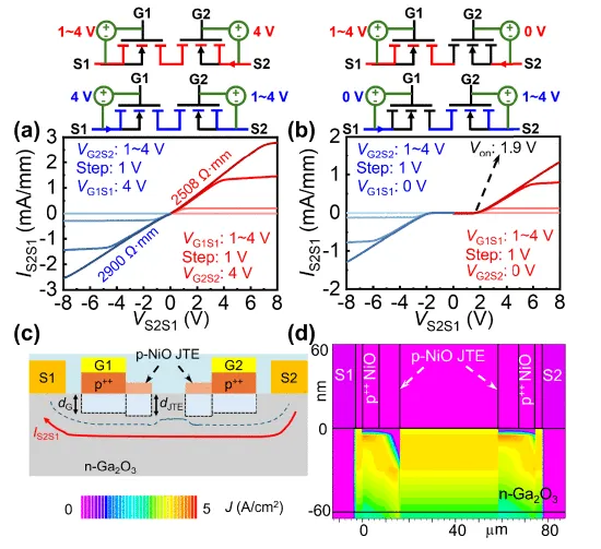 图2 (a) 在晶体管和(b)二极管模式下器件的双向输出特性。(c) 导通态电流分布示意图,展示了耗尽效应的影响。(d) 在正向导通状态下,考虑 NiO/Ga2O3界面处约1012 cm-2负电荷时,Ga2O3 MBDS的仿真电流密度分布图。