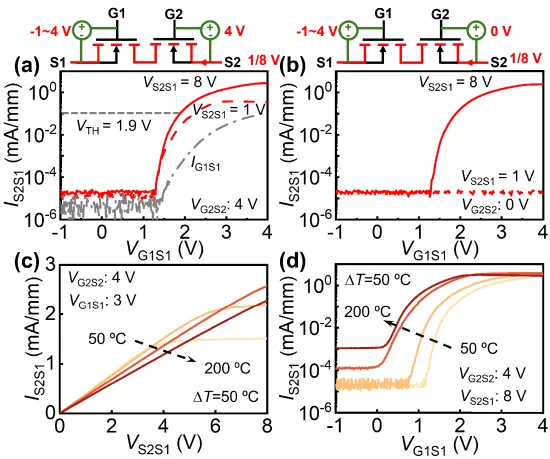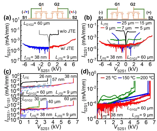 图4 (a) 在VG2S2=VG1S1=0V 条件下,具有与不具有 D-JTE 结构的 Ga2O3 MBDS 的正向与反向阻断特性对比。(b) 不同 JTE 长度条件下 Ga2O3 MBDS 的双极性阻断特性。(c) 不同 JTE 厚度 tJTE及不同栅间距LG1G2条件下的正向阻断特性。虚线表示栅极泄漏电流。(d) 室温与高温条件下的正向阻断特性。