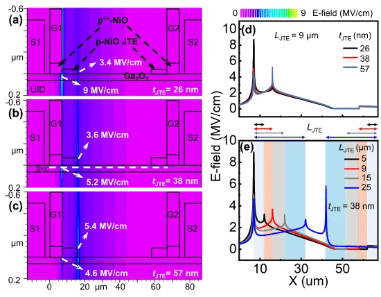 图5 (a)–(c) 在 6 kV 阻断条件下,不同 JTE 厚度 tJTE(26 nm、38 nm、57 nm)对应的 Ga2O3 MBDS 仿真电场分布图。(d) 不同tJTE条件(e)不同对应的仿真电场分布。