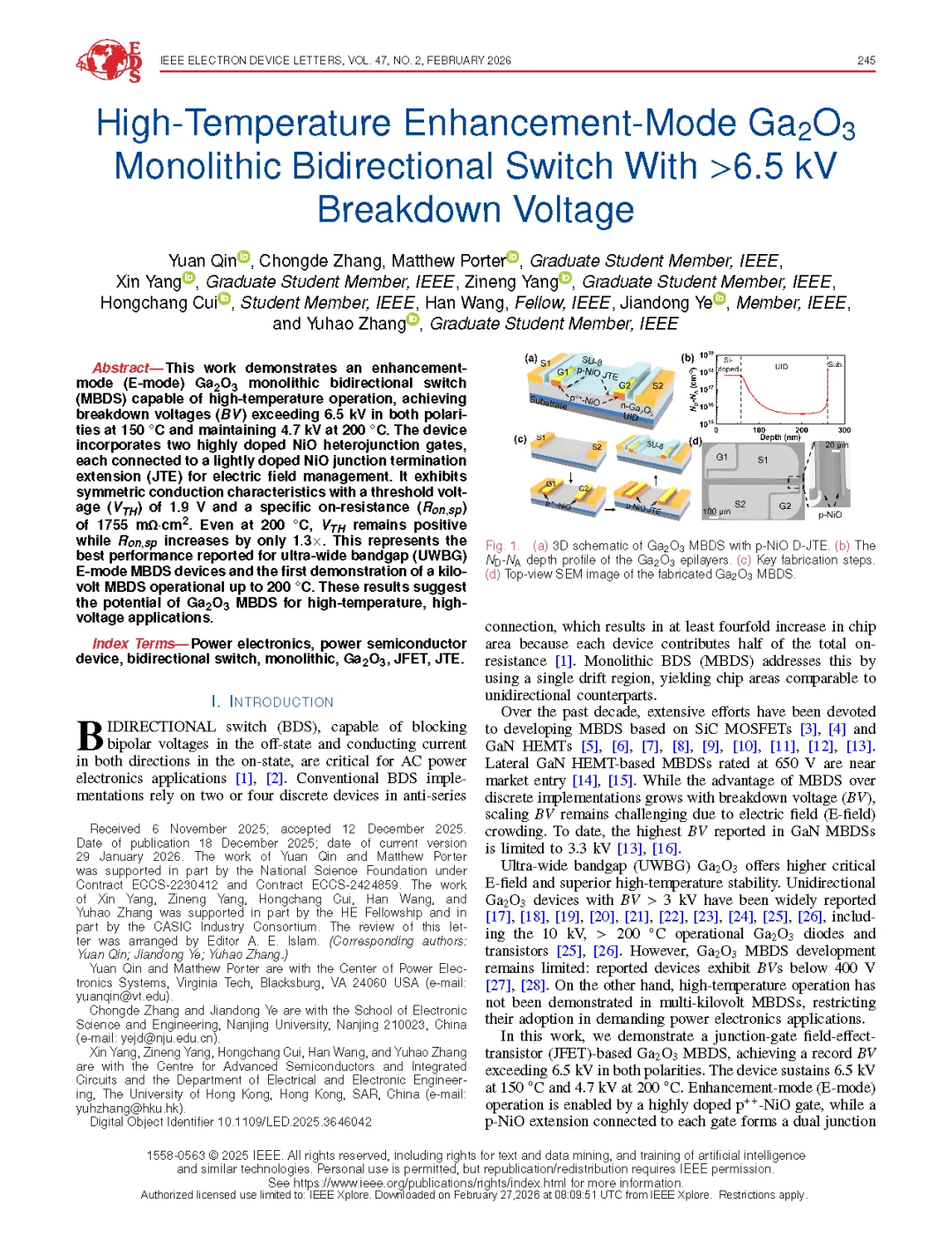 由南京大学叶建东教授、香港大学、弗吉尼亚理工大学的联合团队在学术期刊 IEEE Electron Device Letters 发布了一篇名为 High-Temperature Enhancement-Mode Ga2O3 Monolithic Bidirectional Switch With >6.5 kV Breakdown Voltage(击穿电压超过 6.5 kV 高温增强型 Ga2O3 单片双向开关器件)的文章。