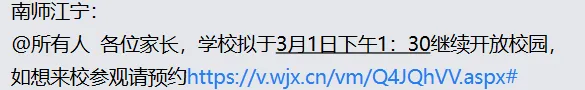3月1日(周日),东南实验初中部举办校园开放日,上午9点44分发的发的登记链接,16分钟后,报名表单截止,登记不了!没有约上的家长也不用担心,群内老师回复:开学后还会有一场!