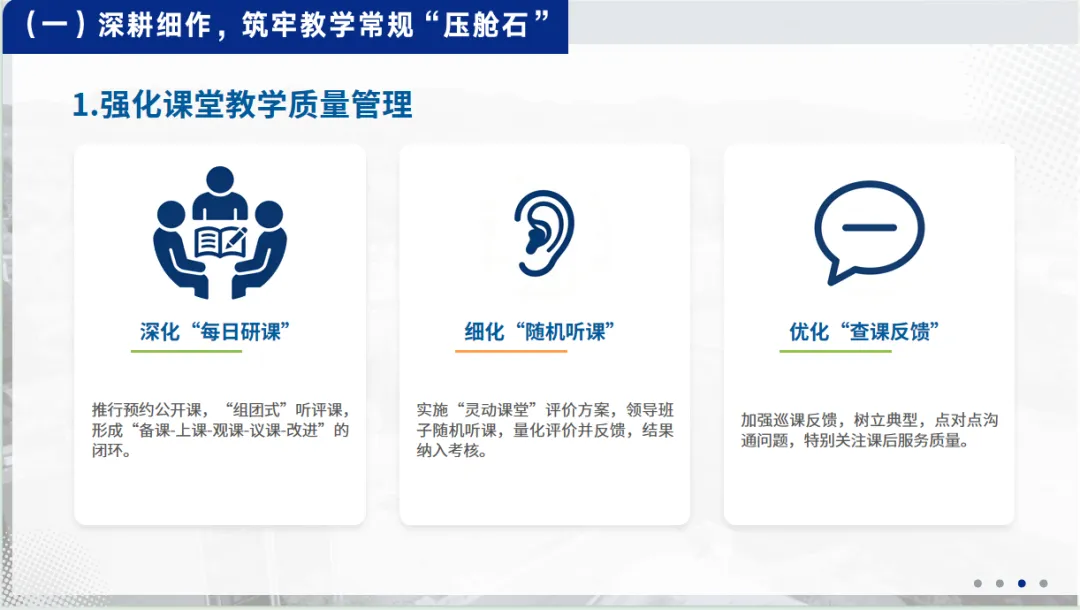教导处韩佳诺主任以本学期教学工作“深耕·赋能·跃升”为题对教育教学工作计划进行解读。从规范常规管理、提速教师成长、夯实学生素养等方面解读新学期的工作。在新学期的起点上,教导处将以“质量为核心,创新为动力,发展为宗旨”全力推进素养课堂建设,全面抓好教学常规管理,全面提升教育教学质量。