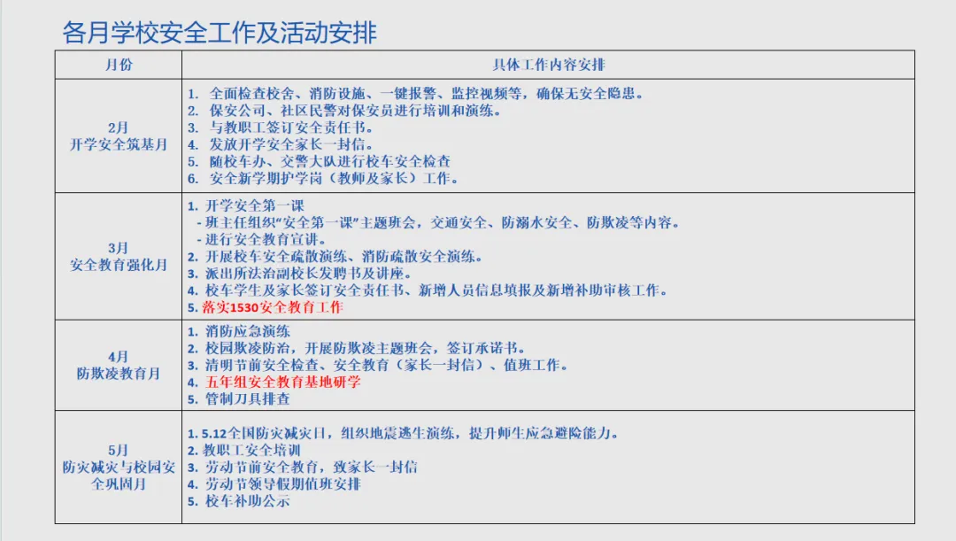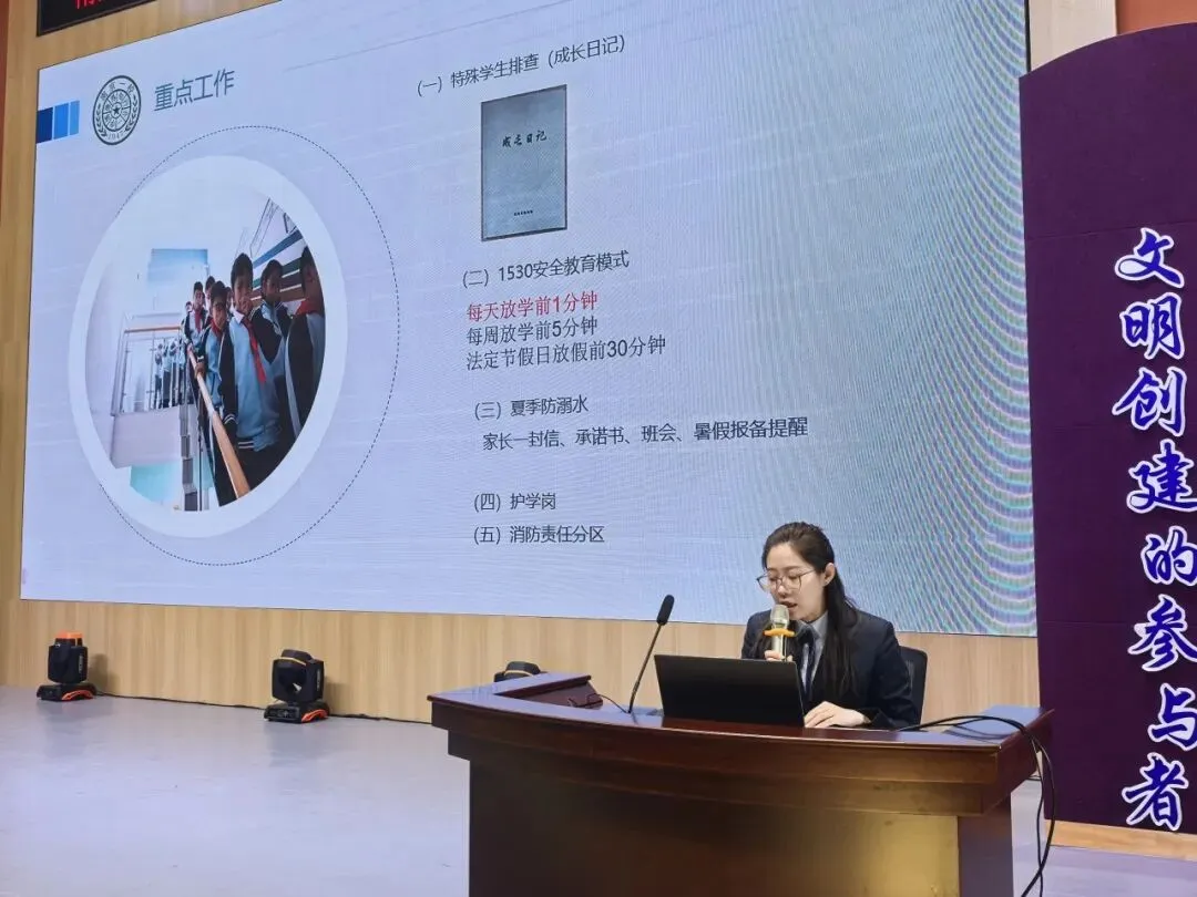 安全科王兰岚主任汇报了本学期工作计划,全面排查并消除校园各类安全隐患实现安全教育全覆盖、常态化,确保本学期校园无重大安全事故、无校园欺凌事件、无溺水等意外伤亡事件,保障春季学期教育教学工作平稳有序开展。