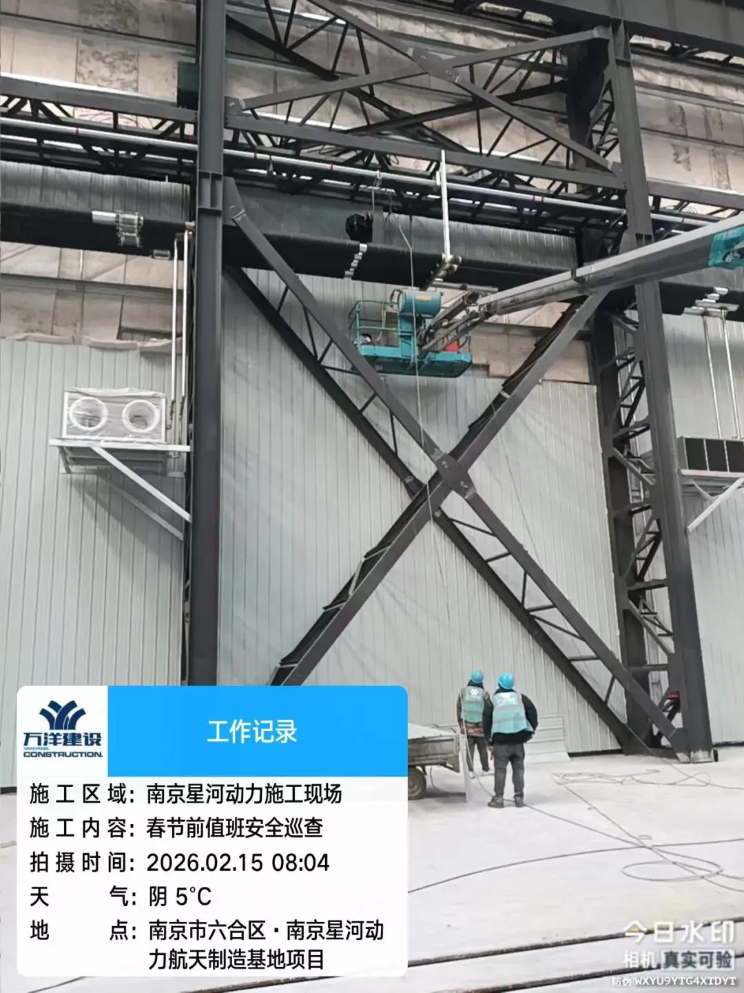 春节不停工!南京星河动力航天制造基地项目一期加速推进新春佳节,万家团圆。南京星河动力航天制造基地项目一期施工现场一派繁忙。我司钢结构安装工人放弃春节休息,坚守岗位、加班施工,聚焦内隔墙施工核心任务,全力冲刺项目建设节点。