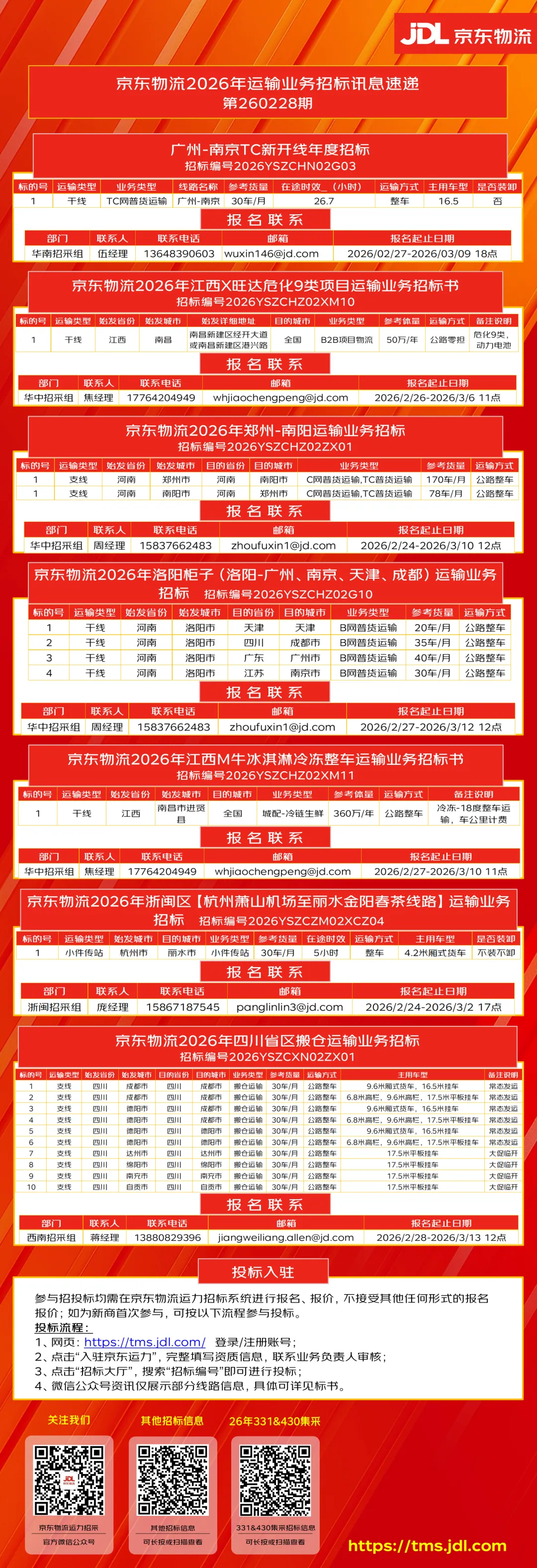 报名方式1、网页:https://tms.jdl.com/ 登录/注册账号;2、点击“入驻京东运力”,完整填写资质信息,联系业务负责人审核;3、点击“招标大厅”,搜索“招标编号”即可进行投标。本宣传资料为投标邀请,所示图片及文字仅供参考,不作为招标人向投标人发出之投标标的及入围承诺,不属于合同内容。本宣传资料制作时间详见发布日期。本公司保留对宣传资料修改的权利,敬请留意最新资料。本信息最终解释权归京东物流运力平台部所有。