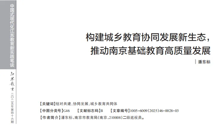 撰写此文,源于对南京教育“百校千师携手共进计划”二十载耕耘的深情回望。教育短板在乡村。通过“大手”拉“小手”推动城乡教育协同发展,是区域教育高质量发展时代命题的破解之道。南京教育人从2006年244所结对校的初次牵手,到今天城乡教育共同体的深度融合,我深刻感受到:教育公平不是削峰填谷,而是通过制度创新让优质资源流动起来。