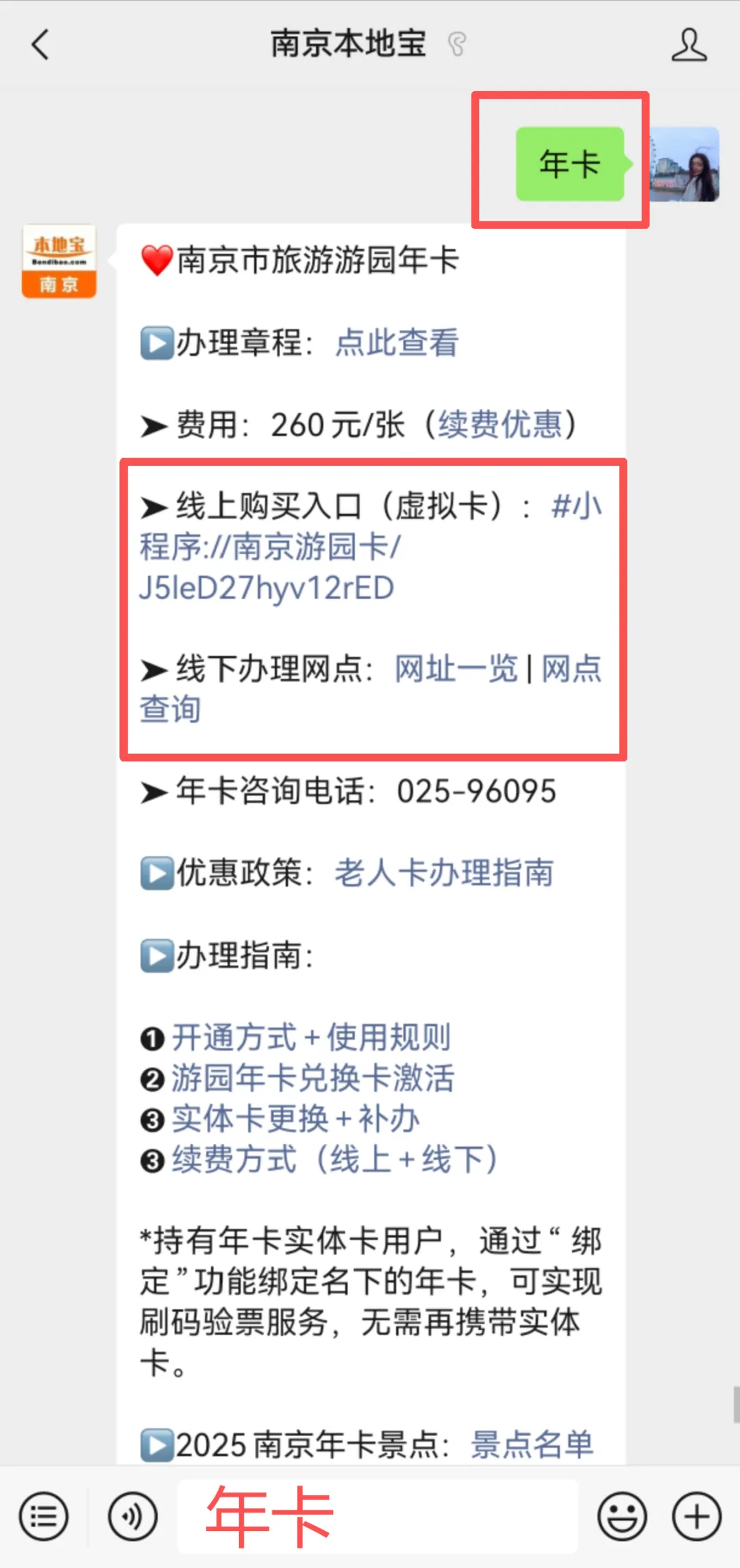 提醒:大家可以在【南京本地宝】对话框回复【年卡】直接获取办理入口、办理攻略等。