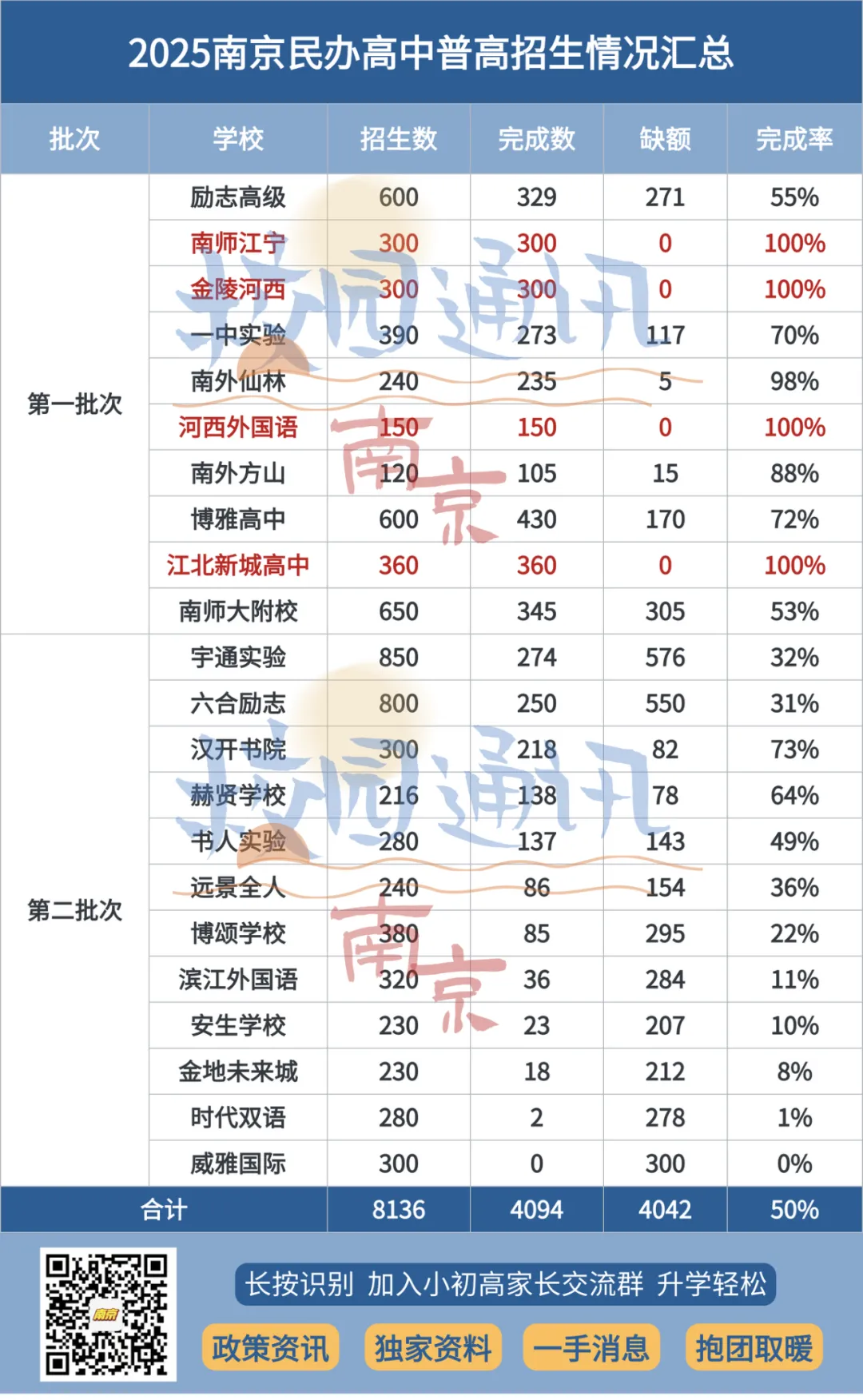 当然,也存在例外,比如金陵河西、南师江宁等头部民办高中,凭借过硬的升学实绩,今年100%顺利完成了招生计划。