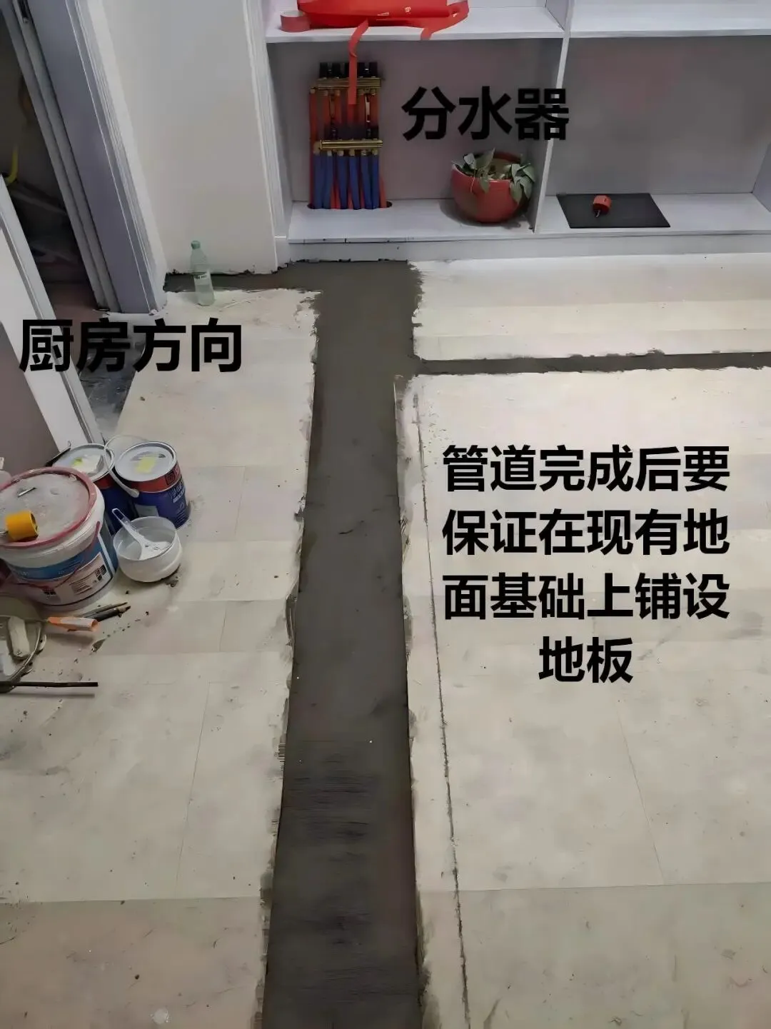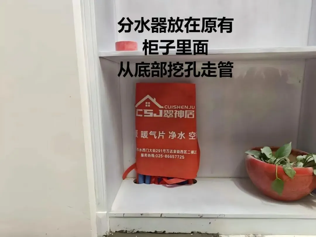 3.厨房空间受限无法安装分水器,综合考虑后期检修方便、管路居中、主管走向,最终将分水器隐藏安装在客厅柜子内,美观又实用。