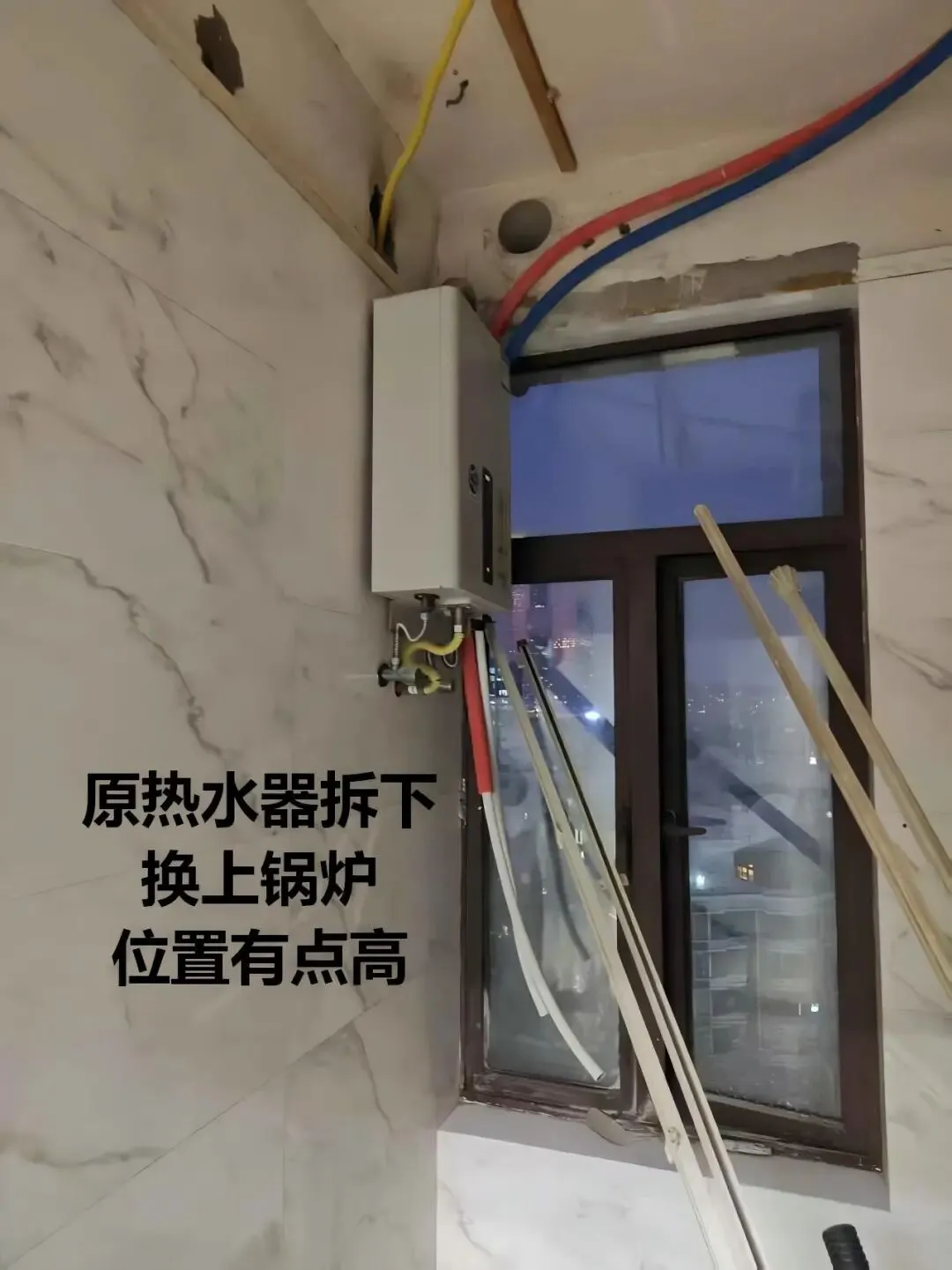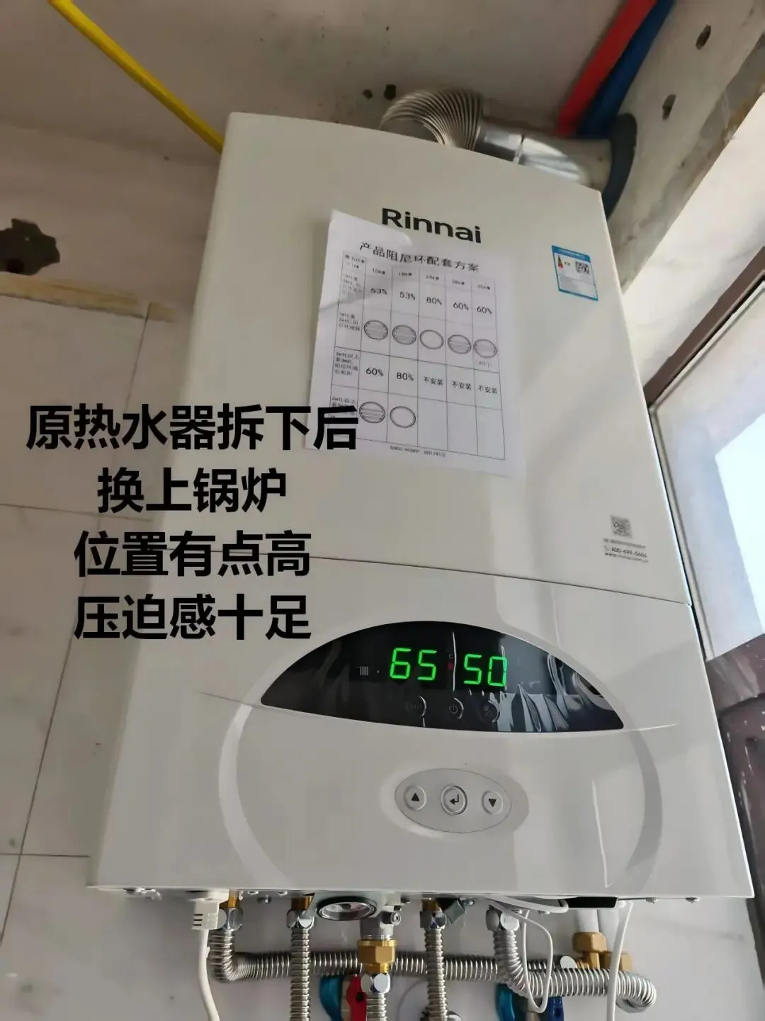2.原热水器安装位置偏高,既要保证壁挂炉正常连接冷热水、燃气,又要兼顾吊顶高度与美观,经过精准定位后顺利完成对接。