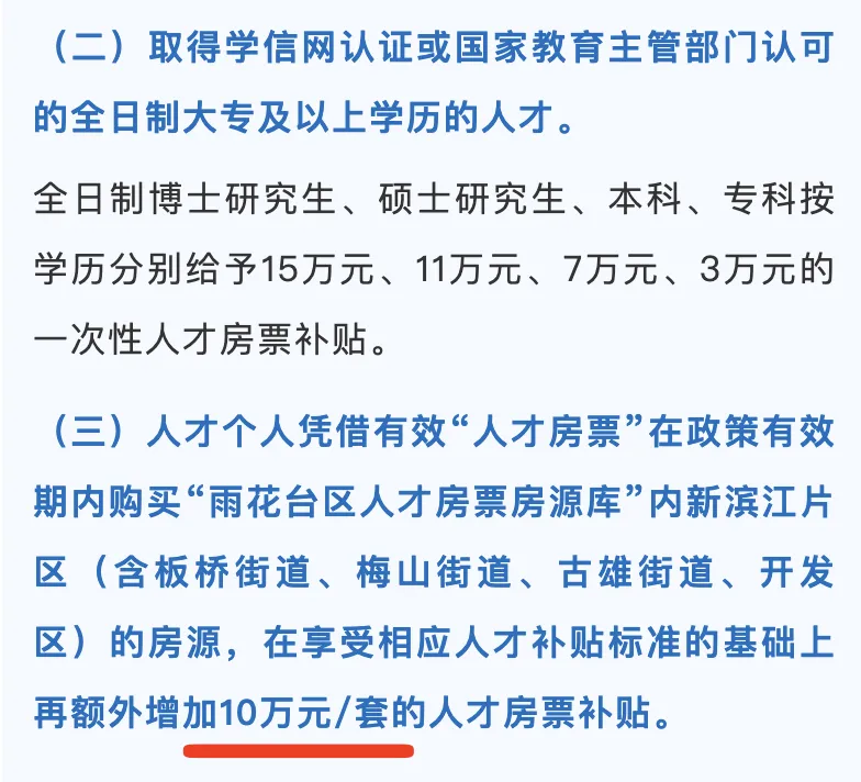 起因是雨花台区的人才房票政策:针对新滨江片区,给出了额外10万元的定向补贴。