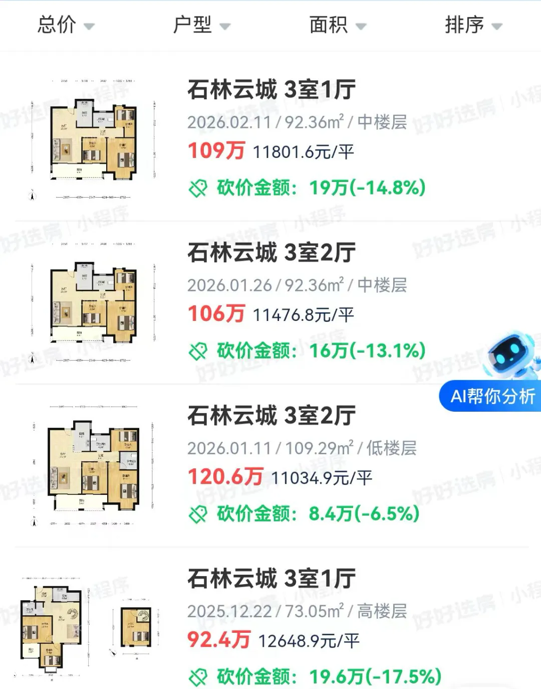 去年石林云城小高层的109㎡户型,总价已经压到了120万起步,单价只要1.1万/平米。