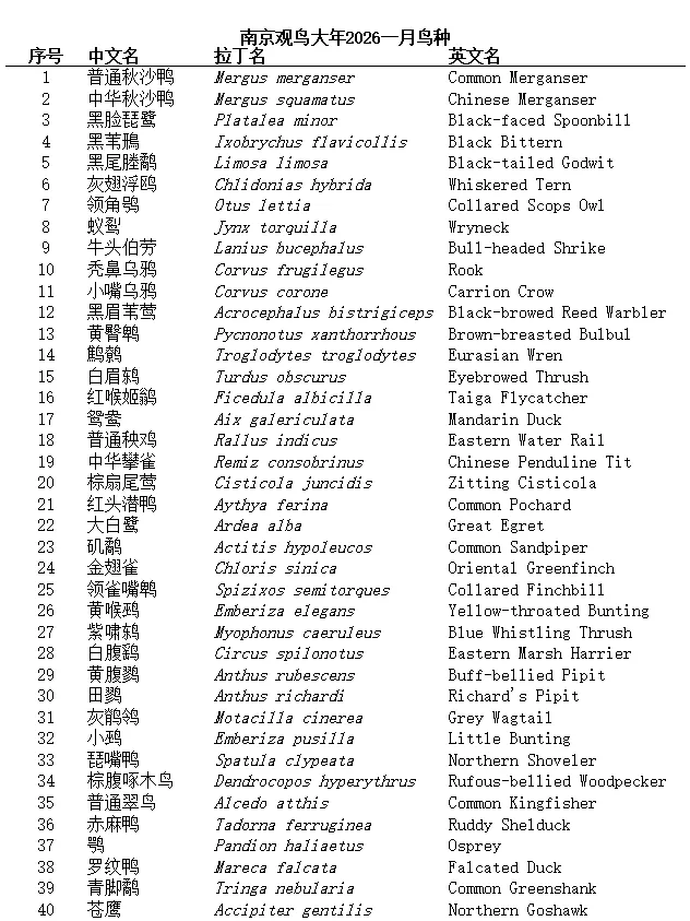 发起了南京观鸟大年2026活动。我们来回顾下一月的成绩。