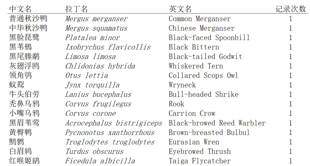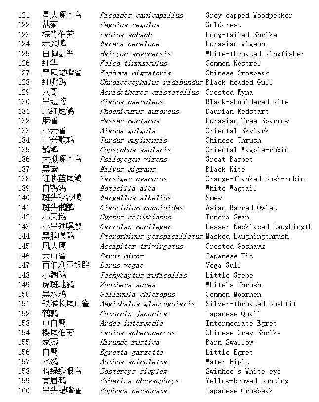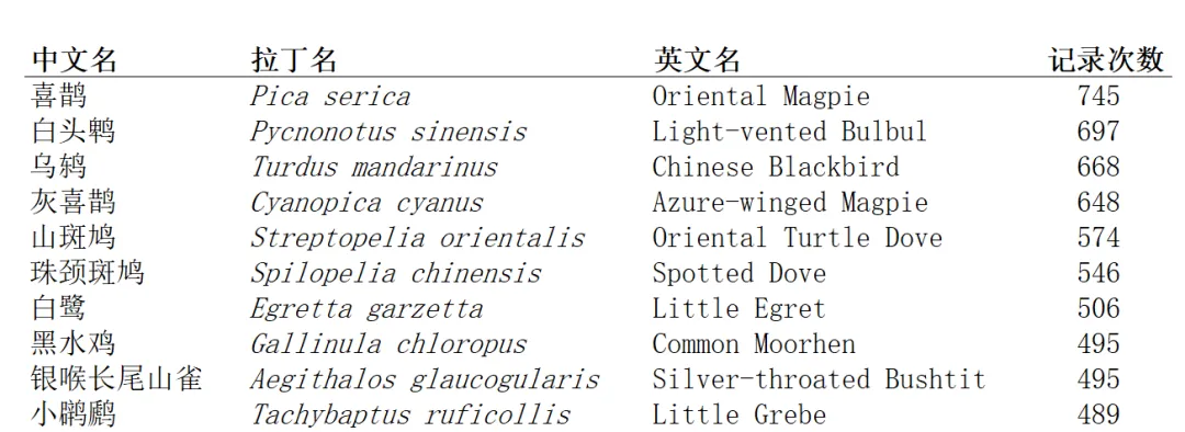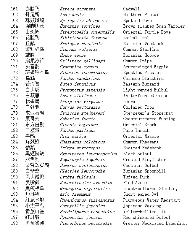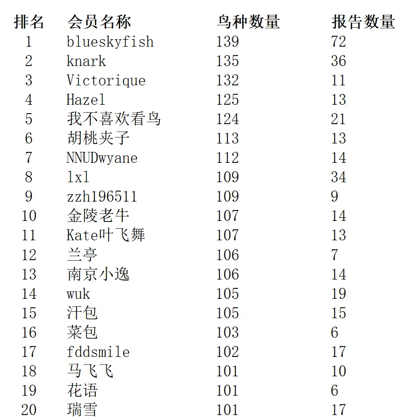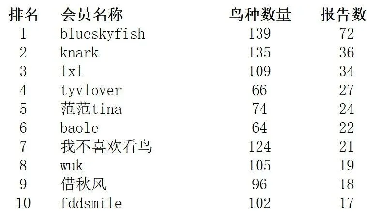 一月共有159名鸟友上传了有效记录1033条,共记录到16目49科198种,详见下表: