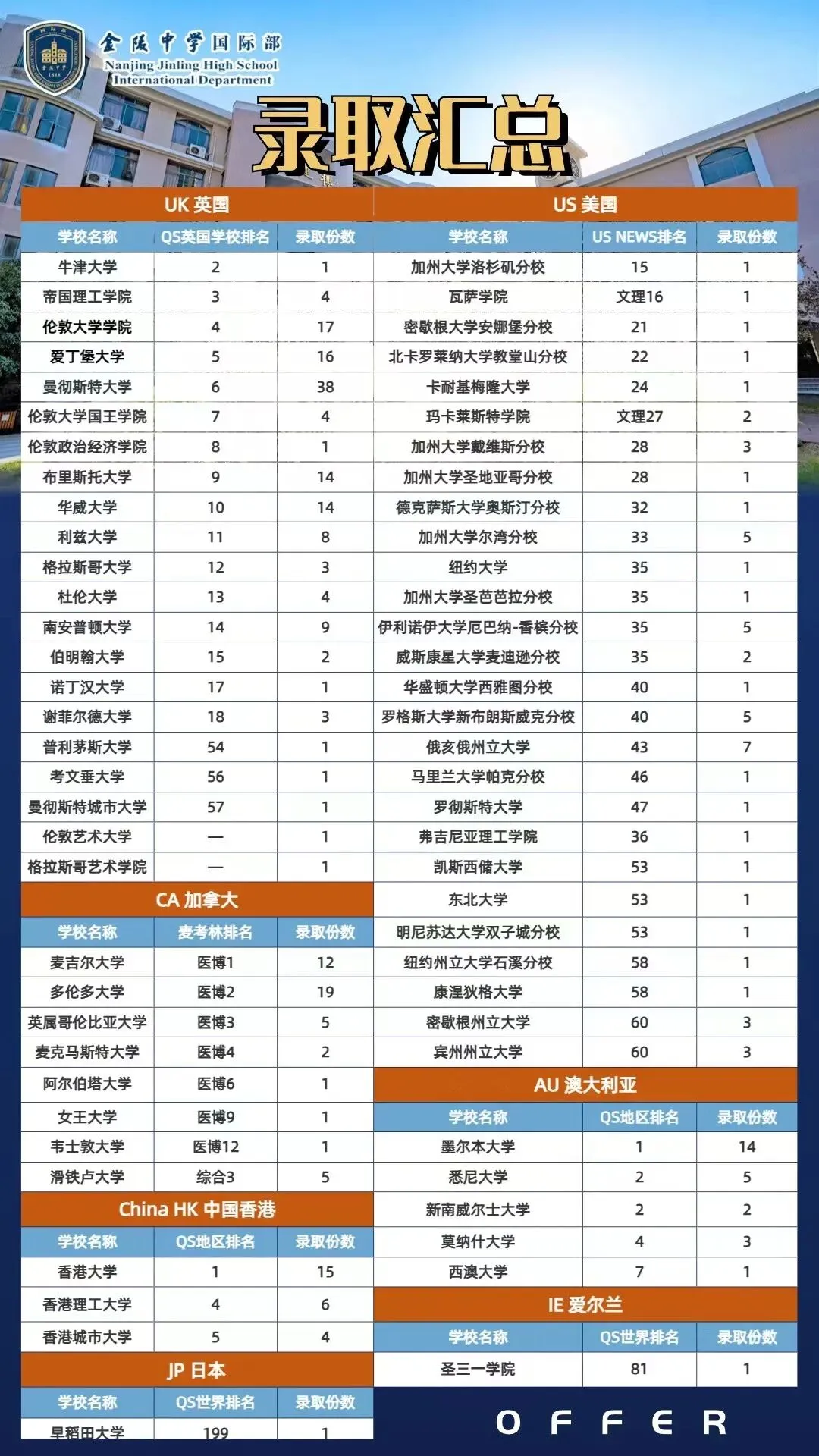 金陵中学自2008年开始引入国际课程,目前学校开设中美班和剑桥班。从择校倾向来说,金中国际部仍然属于南京的第一梯队,生源质量稳定,录取结果也不错。