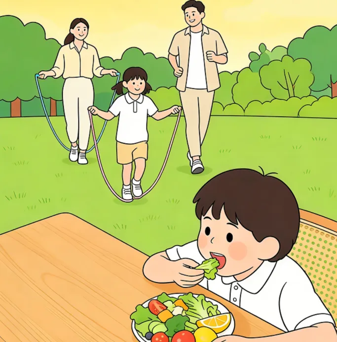 坚持体育锻炼:每天要保证 1 小时的亲子运动时间,可以和爸爸妈妈一起跳绳、到户外散步,或者玩有趣的亲子游戏。坚持运动能增强体质、提高免疫力,让我们少生病,健健康康地在校园里学习和玩耍。