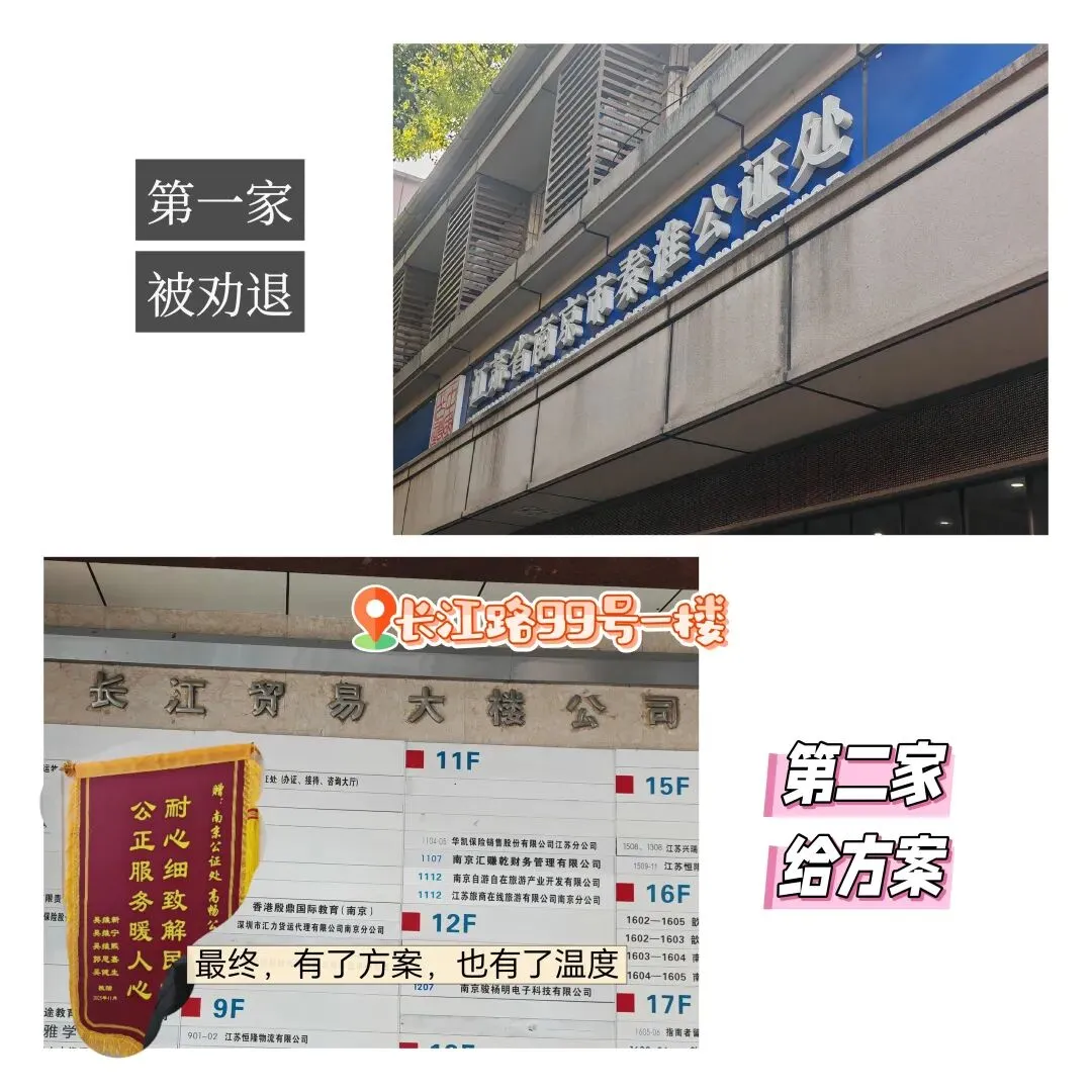 A:我今天跑的两家是秦淮公证处和南京公证处(长江路99号)。后者经验更丰富,建议优先考虑。