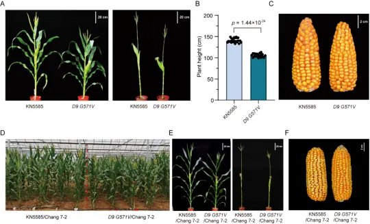 该研究聚焦玉米DELLA蛋白Dwarf 9 (D9),首先借助AlphaFold 3人工智能工具,精准解析了D9蛋白与赤霉素受体蛋白GID1之间的互作结构,发现D9蛋白第571位甘氨酸是维持二者互作的关键位点之一。随后,将该位点突变为缬氨酸(G571V)后,二者间的互作强度变弱。进一步利用CRISPR-Cas9基因编辑技术,创制出D9 G571V精准编辑玉米突变体材料。该突变体株高与穗位高均表现出温和且显著的降低,且对赤霉素处理不敏感,是典型的功能获得性突变体;同时,其果穗形态、穗长、穗粗、粒重等关键产量性状与野生型相比无显著差异,实现了“矮化不减产”。该矮秆性状呈半显性遗传,将D9 G571V与优良自交系昌7-2杂交后,F1代仍稳定保持矮秆表型,且产量表现稳定。