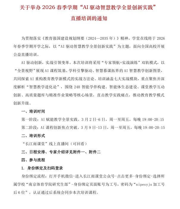 关于举办南京体育学院2026春季学期“AI驱动智慧教学全景创新实践”导师培训的通知
