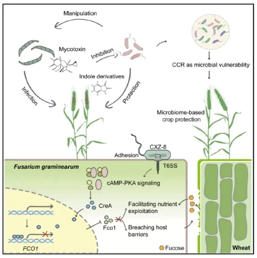 研究团队从田间健康小穗中分离获得一株有益细菌CXZ-8。对峙培养及发酵产物实验显示,该菌株对禾谷镰孢的营养生长无显著抑制作用,区别于传统“直接抑菌”的策略。显微观察发现,CXZ-8特异性富集并紧密附着于病原菌侵染结构周围,提示其通过接触依赖方式干预侵染过程。转录组分析表明,CXZ-8附着诱导病原菌碳代谢相关基因显著重排,差异基因启动子区域普遍富集碳代谢阻遏核心因子CreA结合位点。机制研究显示,CreA在不同营养条件下发生核质穿梭,其出核是解除致病基因抑制、启动侵染程序的关键步骤。然而在CXZ-8附着条件下,CreA被持续稳定地滞留于细胞核内,维持CCR状态,使病原菌陷入功能性“碳饥饿”,无法完成向侵染生长的转换。研究还鉴定了CreA直接调控的关键靶基因FCO1,编码酶参与寄主屏障破坏与营养获取,其持续受抑是侵染受阻的重要原因。大规模田间细菌资源筛选显示,约20%的菌株在不同程度上具备稳定CreA核定位的能力,影响和操纵CCR状态可能是自然界中普遍存在的细菌-真菌互作模式。基于该机制构建的复合菌群RMC1-1在温室和田间条件下均显著降低小麦赤霉病发生,并对水稻稻瘟病、苹果树腐烂病及小麦茎基腐病等多种真菌病害表现出良好防控效果。
