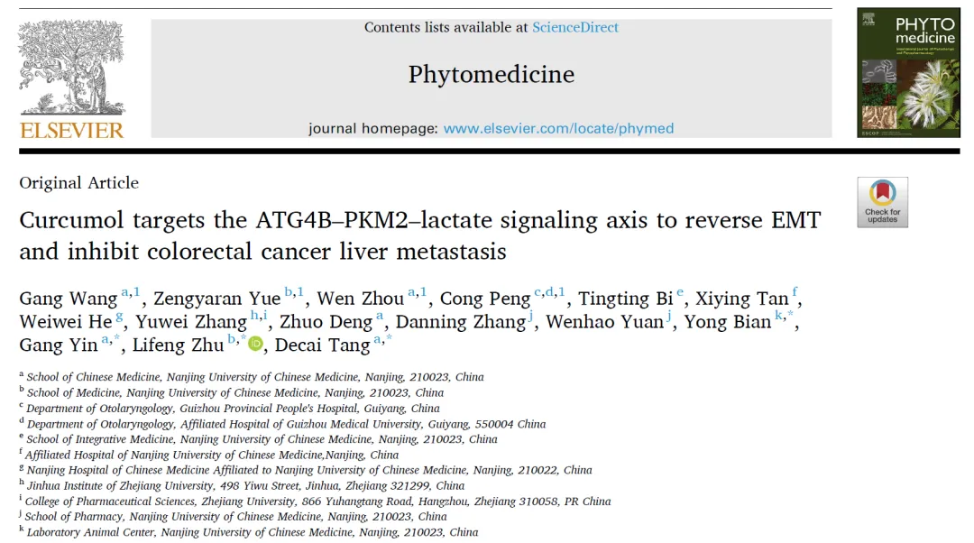 2026年2月,南京中医药大学团队在期刊《Phytomedicine》(IF:8.3)在线发表题为:Curcumol targets the ATG4B-PKM2-lactate signaling axis to reverse EMT and inhibit colorectal cancer liver metastasis的高水平研究论文。