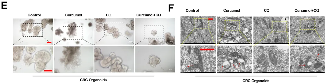 图1. (E) Curcumol和CQ处理对CRC类器官模型中类器官生长的抑制作用。(F) 采用透射电子显微镜(TEM)分析CRC类器官自噬相关结构形成(红色箭头),在单独使用Curcumol或联合CQ处理后。