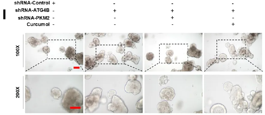 图2. (I)患者来源的CRC类器官在shRNA对照、shRNA-ATG4B、shRNA-ATG4B shRNA-PKM2,以及shRNA-ATG4B Curcumol条件下的代表性明场图像。