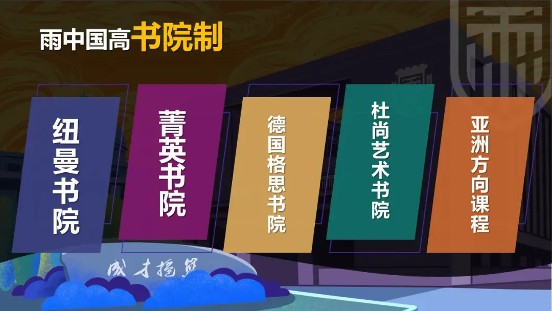 从2023年起,雨中国高已全面进入“书院制”。在学习过程中,学生们除了可以享有任课老师、导师提供的学业指导外,还可以得到书院内高年级学长的支持。横纵交织,不同书院的每一位学生将会得到更加个性化的学习方案和学业指导。