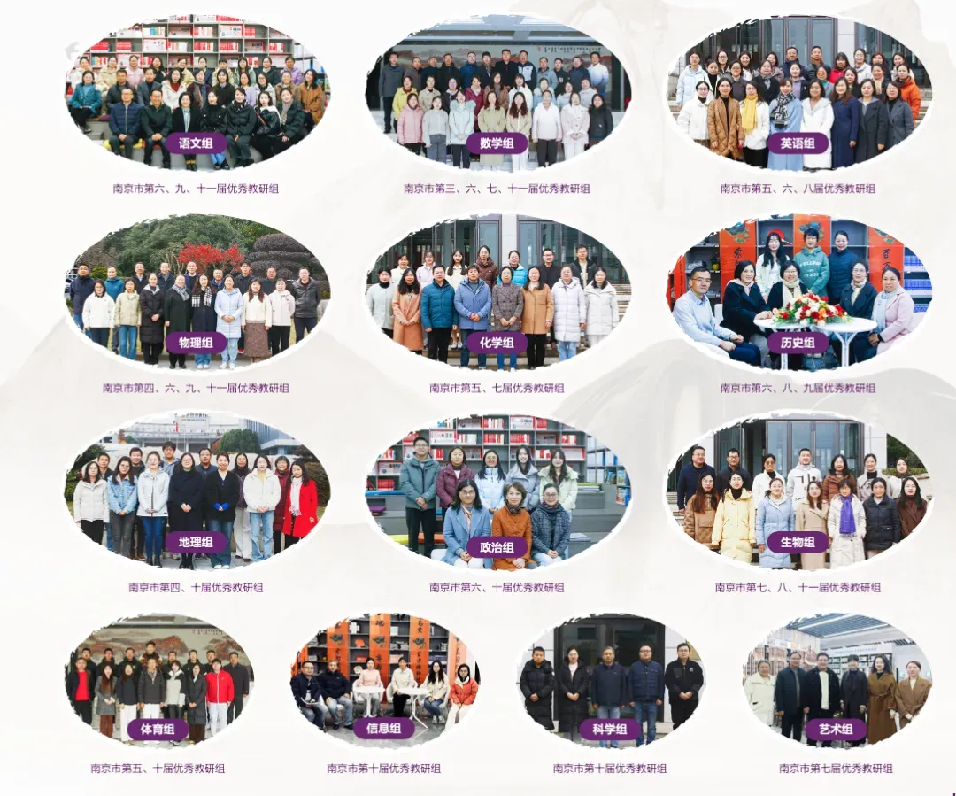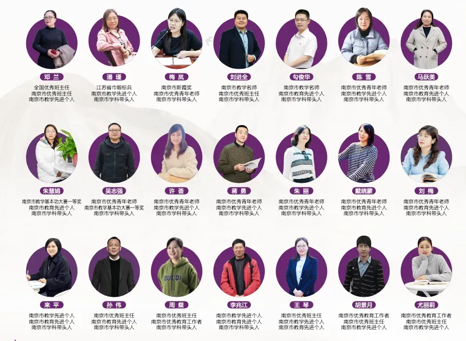 目前学校拥有一校两址(紫荆花路校区和岱山校区),专任教师267人,现已形成了一支师德高尚、业务精湛、理性包容、追求卓越的优秀教师队伍。学校现有正高级教师11人,省特级教师9人,市区学科带头人128人,具有研究生以上学历老师115人。学校所有学科均是南京市优秀教研组。