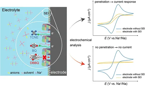 针对上述挑战,南京工业大学陈宇辉、Fengjiao Yu等人提出并建立了一套基于氧化还原介体分子的电化学探测方法。该方法选取一系列具有可逆电化学行为但尺寸不同的有机小分子作为“分子尺”,通过它们能否穿透SEI并在电极表面发生反应来判断SEI中扩散通道的最小孔径。研究综合运用了电化学阻抗谱、差分电化学质谱和分子动力学模拟,系统探究了在两种典型溶剂体系和四种常用钠盐中形成的SEI。