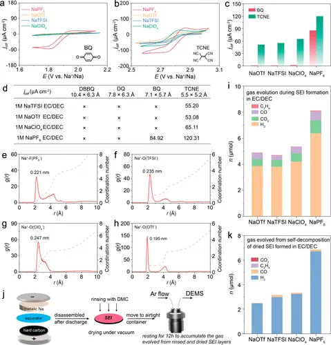 图3. 碳酸酯电解质中形成的SEI层扩散通道特性。(a) BQ和(b) TCNE在不同电解质中沉积SEI后的电极上的CV曲线。(c) 扩散极限电流密度比较及(d) 不同电解质中形成SEI层的介体渗透情况总结。通过分子动力学模拟获得的Na+与(e) PF6–、(f) TFSI–、(g) ClO4–和(h) OTf–阴离子的径向分布函数及配位数。(i) DEMS定量分析的SEI形成过程中释放的多气体组分(CO、CO2和H2)。(j) 示意图及(k) 去除残留电解质后干燥SEI的产气定量分析,展示SEI层自身的自分解过程。