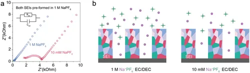 图2. 体相电解质中盐浓度对SEI层的影响。(a) 在1 M NaPF6-EC/DEC中沉积SEI后,于1 mM和10 mM NaPF6电解液中测得的SEI奈奎斯特图。(b) 示意图展示SEI通道中的Na+如何受体相电解质影响。