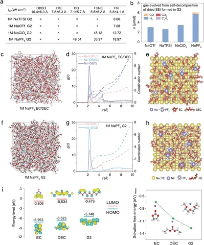 图4. 醚类与碳酸酯类电解质中形成SEI的对比。(a) 1 M不同盐在G2中形成的SEI层内介体渗透情况总结。(b) 去除残留电解质后干燥SEI的产气情况,展示基于G2电解质形成的SEI层自身发生的自分解。针对体相电解质的分子动力学模拟:(c–e) NaPF6-EC/DEC和(f–h) NaPF6-G2溶剂:(c, f) 模拟快照,(d, g) 径向分布函数及配位数,(e, h) 钠电极表面吸附模拟快照。(i) 三种溶剂的HOMO–LUMO能级及(j) 与Na+的溶剂化自由能。