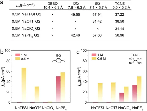 图5. (a) 0.5 M不同盐在G2中形成的SEI层内介体渗透情况总结。不同盐浓度(0.5 M与1 M)下(b) BQ与(c) TCNE的扩散极限电流密度对比。