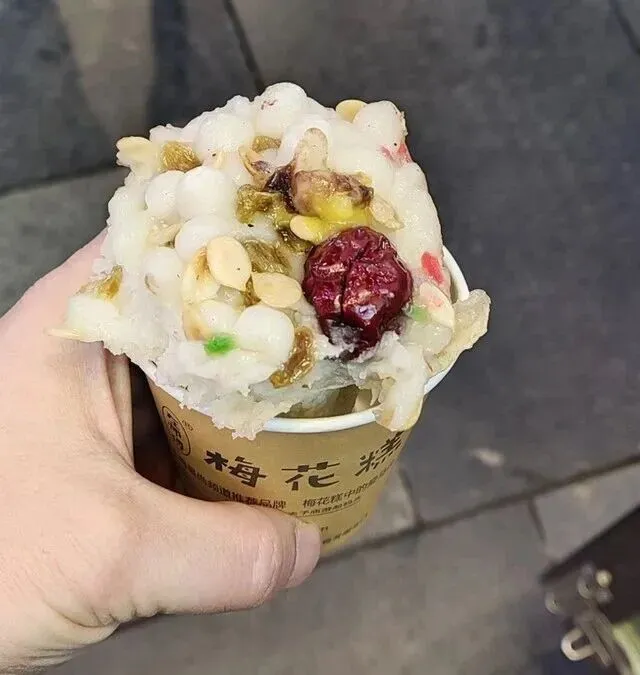 2.夫子庙的梅花糕,10元,此糕内有馅,烫嘴,我就是没注意被烫到了。