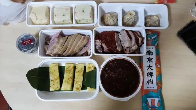 十三、吃:由于是春节出游,除了各景点周边的餐饮店在营业外,很多都关门了,所以只能在景点附近就餐,这个没办法。南京大牌档的生意实在是太火爆,懒得排队,点了外卖,盐水鸭、烤鸭都不错,其它的也能接受,不算太出彩。