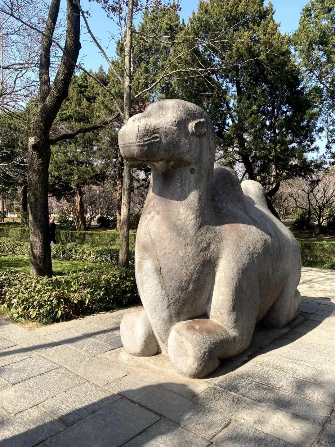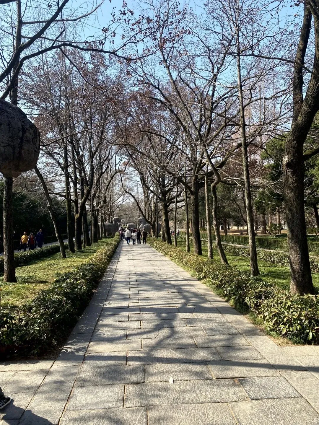 吃好饭回到中山陵停车场,刚停好车就有黄牛凑过来:“给100块,直接带你进景区里面。”这种一般不能信,总感觉是套路。我们没搭理,问了工作人员,说走路去明孝陵不远。果然,走了十几分钟就到了明孝陵博物馆。小朋友说想进去看看,扫码登记免费进,不大,十几分钟就逛完了。出来继续走一小段,从5号口进明孝陵,一进去就是著名的石象路,旁边还有梅花园。
