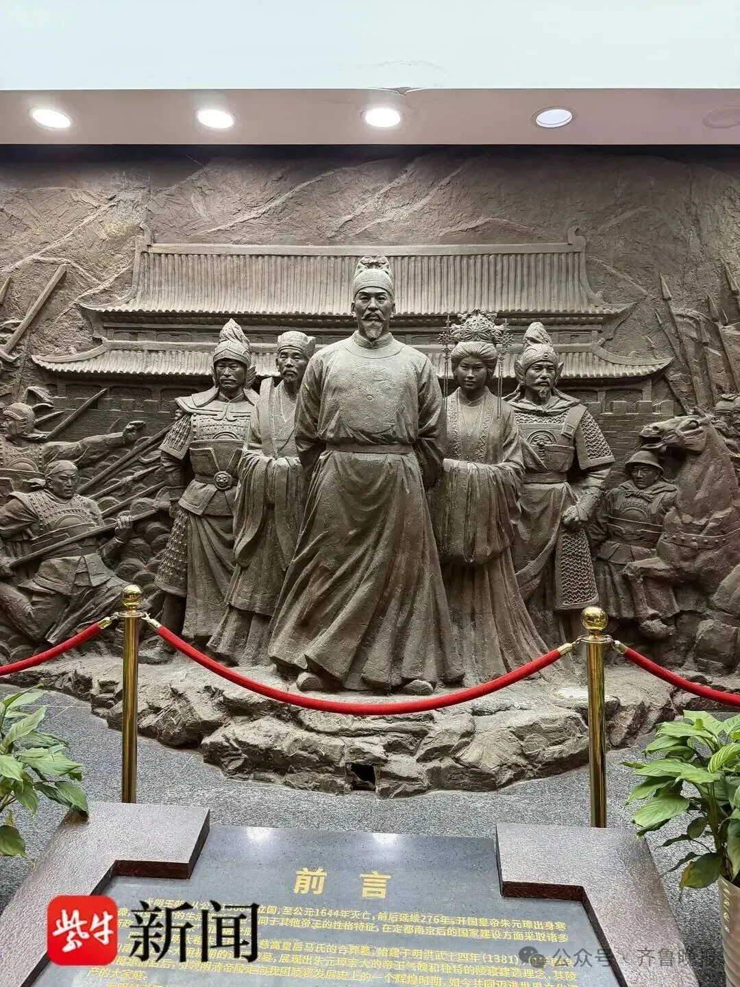 记者浏览全馆看到,馆里其实有两张朱元璋画像,形象一致。门口及出口处有两尊朱元璋雕塑,一尊骑马的雕塑能看出他的脸型有点长,但样子十分威武,而另一尊与皇后和大臣一同站立的雕塑则充满了帝王威仪,和“鞋拔子脸”的画像差距明显。