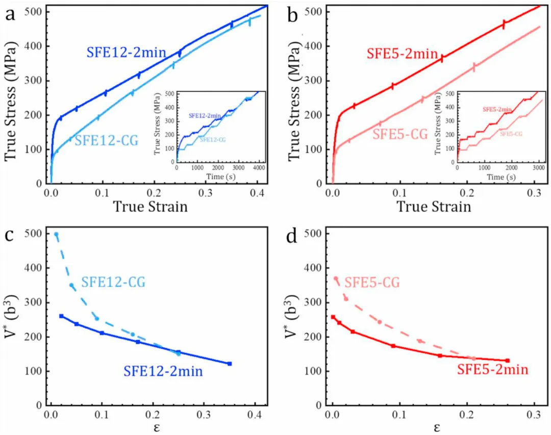 · 物理激活体积(V*) 测试表明,SMAT样品和低SFE合金的初始V*更小,说明纳米孪晶和堆垛层错有效限制了位错运动范围。