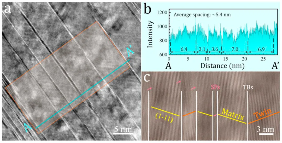 图 8 从 [110] 晶带轴观察的拉伸变形 0.22 应变的 SFE5 合金中纳米孪晶的原子尺度 TEM 图像。(a) HRTEM 图像,(b) (a) 中纳米孪晶衬度的强度图,(c) (a) 中棕色方框区域的原子微结构放大图。