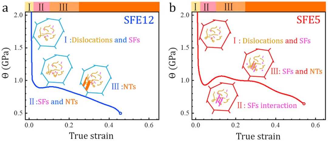 图 9 在加工硬化曲线的不同阶段,SMAT 处理样品变形机制的示意图。(a) SFE12 合金;(b) SFE5 合金。