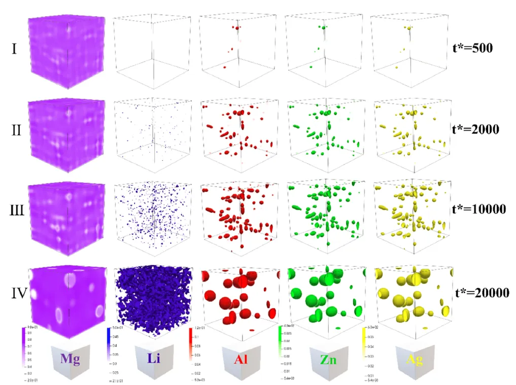 图 5. LAZQ11233 合金中相变的相场模拟结果。 Mg(Al, Zn, Ag)Li₂ 相和富锂团簇的微观结构演化。主要阶段包括:I,形核;II,定向粗化;III,平衡;IV,奥斯特瓦尔德熟化。序参量(任意单位)定义在 0 到 1 的范围内,表示从无序固溶体向完全有序 D0₃-Mg(Al, Zn, Ag)Li₂ 相的转变。