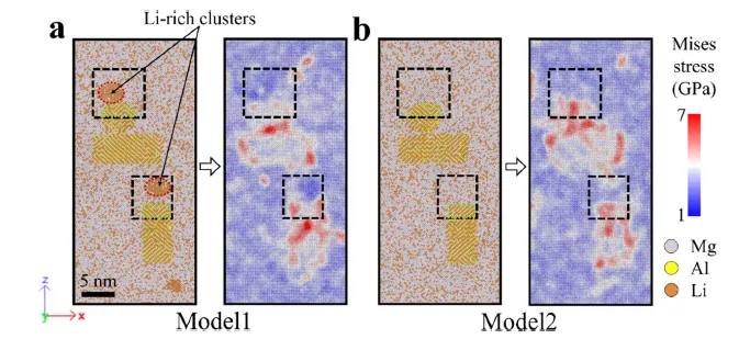 缓解界面应力:分子动力学模拟显示,在无富锂团簇时,析出相与基体界面存在严重的应力集中。而富锂团簇的存在能有效降低界面的应力集中,使得析出相与基体的界面更加共格、稳定,从而延缓了析出相的粗化动力学。