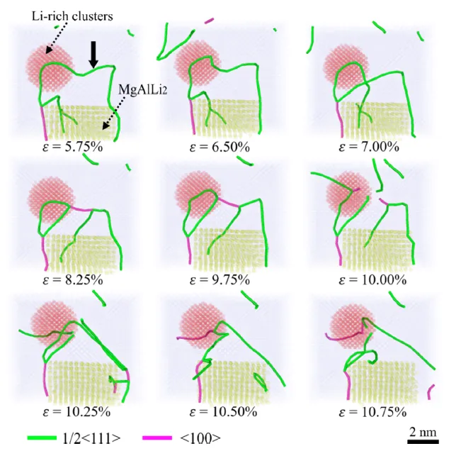 图 14. 位错与富锂团簇之间的相互作用。 显示位错切过富锂团簇的序列快照。