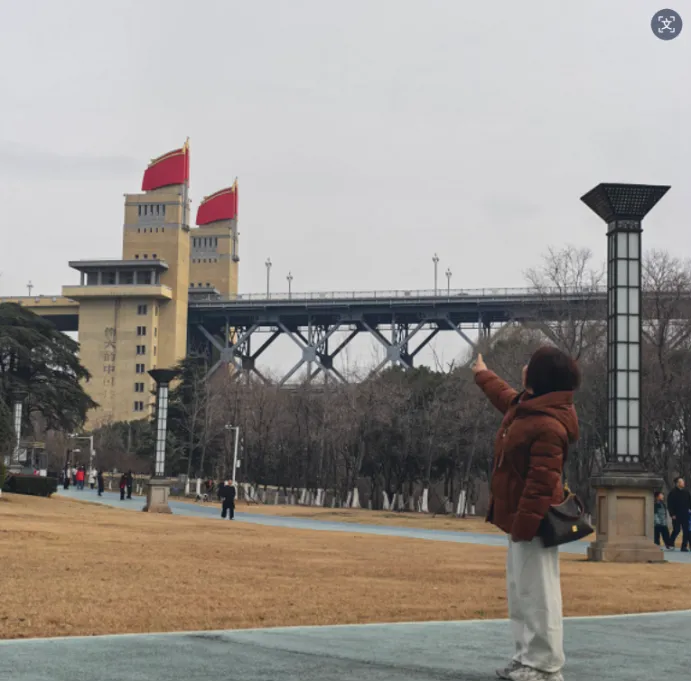 (2)标志性桥头堡:南北大堡高 70 米,顶部是三面红旗造型(红色玻璃钢砖,双曲面微倾模拟飘扬态);小堡配工农兵群像雕塑;公路桥护栏有 200 幅铸铁浮雕,展现山河与建设成就;150 对玉兰花形路灯,夜景格外典雅。