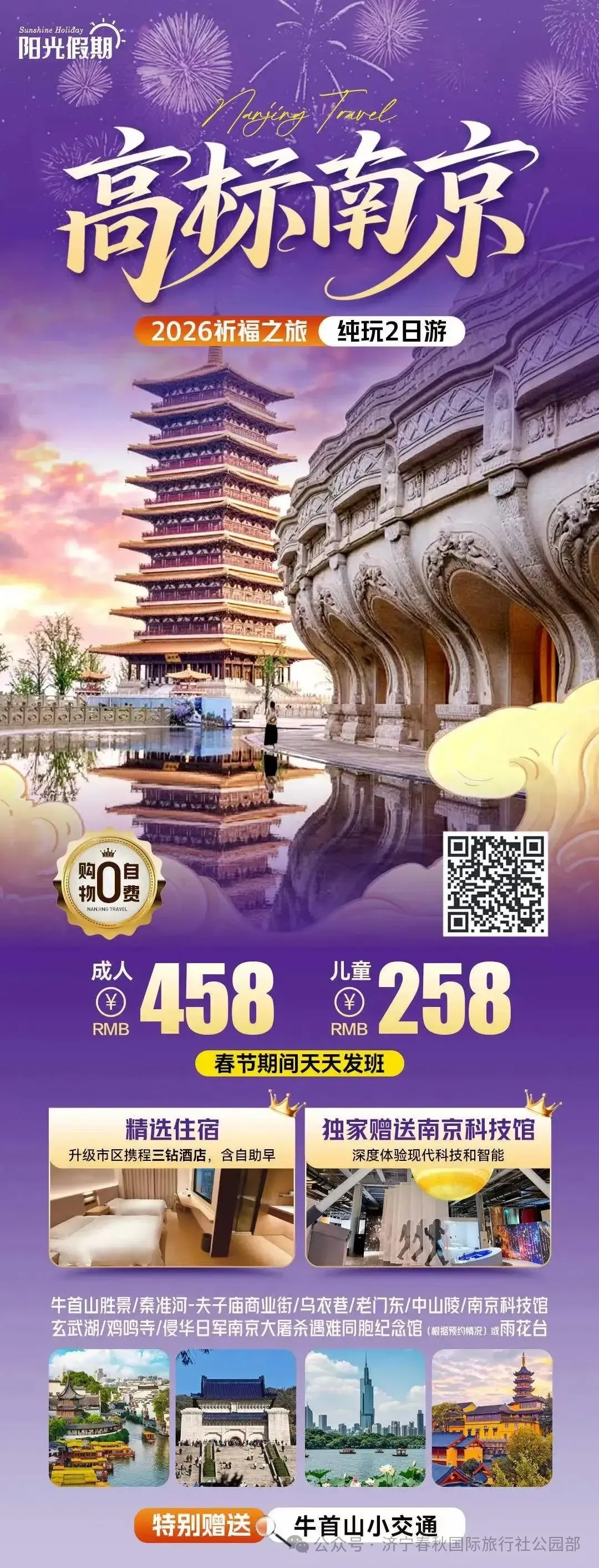 早餐后参观【中山陵】(游览时间1.5小时)包括博爱坊、墓道、陵门、碑亭、祭堂和墓室等建筑。中山陵是孙中山的陵墓,陵墓的入口有孙中山手书的“博爱”两个金字。整个建筑群依山势而建,由南往北排列在一条中轴线上,墓地全局呈“警钟”形图案。温馨提示:钟山景交(中山陵景区)至25年10月起实行交通管制,工作日09:00-17:00,节假日、双休日08:30-17:30,这个时间段大巴车及机动车禁行,不能进景区,需乘景区接驳车前出中山陵,接驳车费用单趟10元/人,来回20元/人,敬请自理,车程约10分钟左右!之后前往游览金陵四十八景之一的【玄武湖】(游览时间1.5小时),此湖位于南京城北,为南京著名的旅游景点,明代时期是朱元璋的黄册库,清朝为召开南洋劝业会开放,湖内有五座小岛,环湖烟柳为金陵四十八景之一,湖边环绕南京明代的古城墙。春天的湖边烟柳环绕,樱州之上樱花烂漫,海棠盛开,漫步其中,让人陶醉,游人泛舟湖上,春意黯然。后赠送金陵赫赫有名的千年古刹【鸡鸣寺】求姻缘,拜财神(香花券10元--15元/人自理)在南京人眼里,鸡鸣寺是一座祈福许愿求姻缘很灵验的寺院,其灵验之准还被誉为是南京十大都市传说之一。鸡鸣寺至今已有一千七百多年的历史,是南京最古老的梵刹和皇家寺庙之一,香火一直旺盛不衰,自古有“南朝第一寺”,“南朝四百八十寺”之首的美誉。一个以报恩为主题的景点,让人们“知恩,报恩,感恩”。赠送【南京科技馆】位于江苏省南京市雨花台区紫荆花路9号,总占地面积15万平方米,主建筑面积约3万平方米,水面积5万平方米 南京科技馆被全国青少年素质教育基地。2010年,南京科技馆被评为国家4A级旅游景区。2022年3月30日,南京科技馆被中国科学技术协会评为全国科普教育基地。后参观【侵华日军南京大屠杀遇难同胞纪念馆】通称江东门纪念馆,位于江苏省南京市建邺区水西门大街418号,选址于南京大屠杀江东门集体屠杀遗址及遇难者丛葬地,是中国首批国家一级博物馆,首批全国爱国主义教育示范基地,全国重点文物保护单位,首批国家级抗战纪念设施、遗址名录,也是国际公认的二战期间三大惨案纪念馆之一。