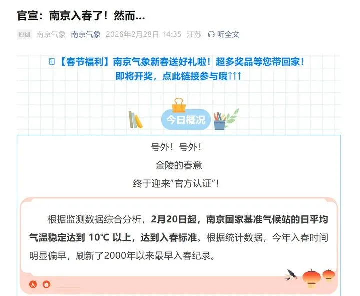 2月28日,南京气象官方微信公众号发布消息称:南京正式官宣入春。根据监测数据综合分析,2月20日起,南京国家基准气候站的日平均气温稳定达到10℃以上,已达到气象学意义上的入春标准,据统计数据显示,今年南京入春时间明显偏早,成功刷新了2000年以来最早入春纪录,让市民提前感受到了春的气息。