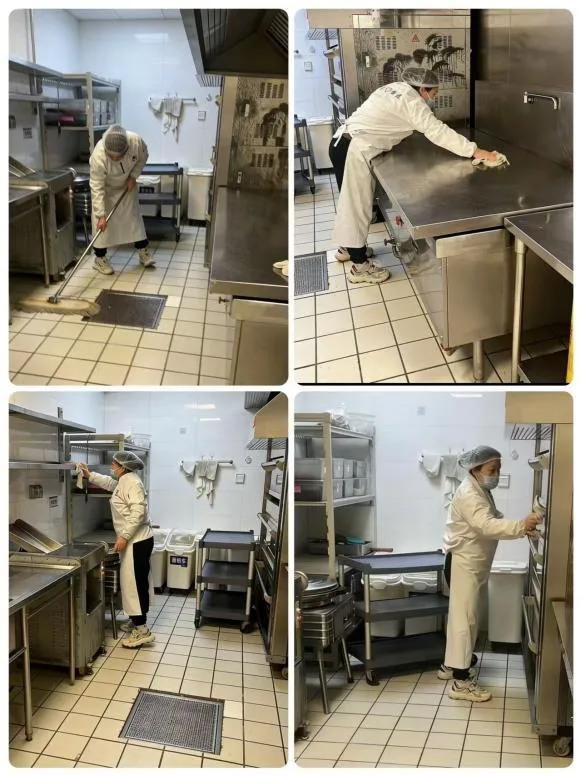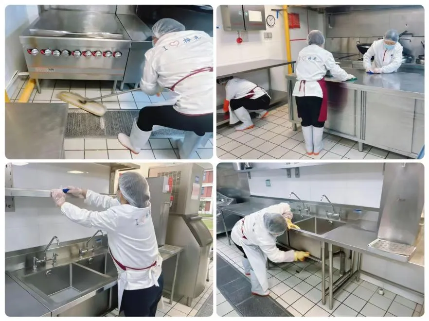 食堂卫生深度清洁:后厨、餐厅、储物间、操作台面全面清扫、冲洗、消杀,做到环境整洁、无油污、无死角。